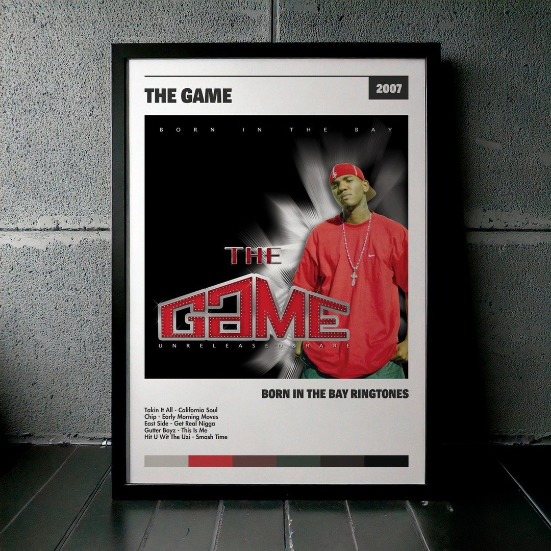 Nuestra colección de cuadros de The Game captura la esencia de sus álbumes más icónicos, presentados en un elegante estilo, en este caso te presentamos el de su disco Born In The Bay Ringtones.