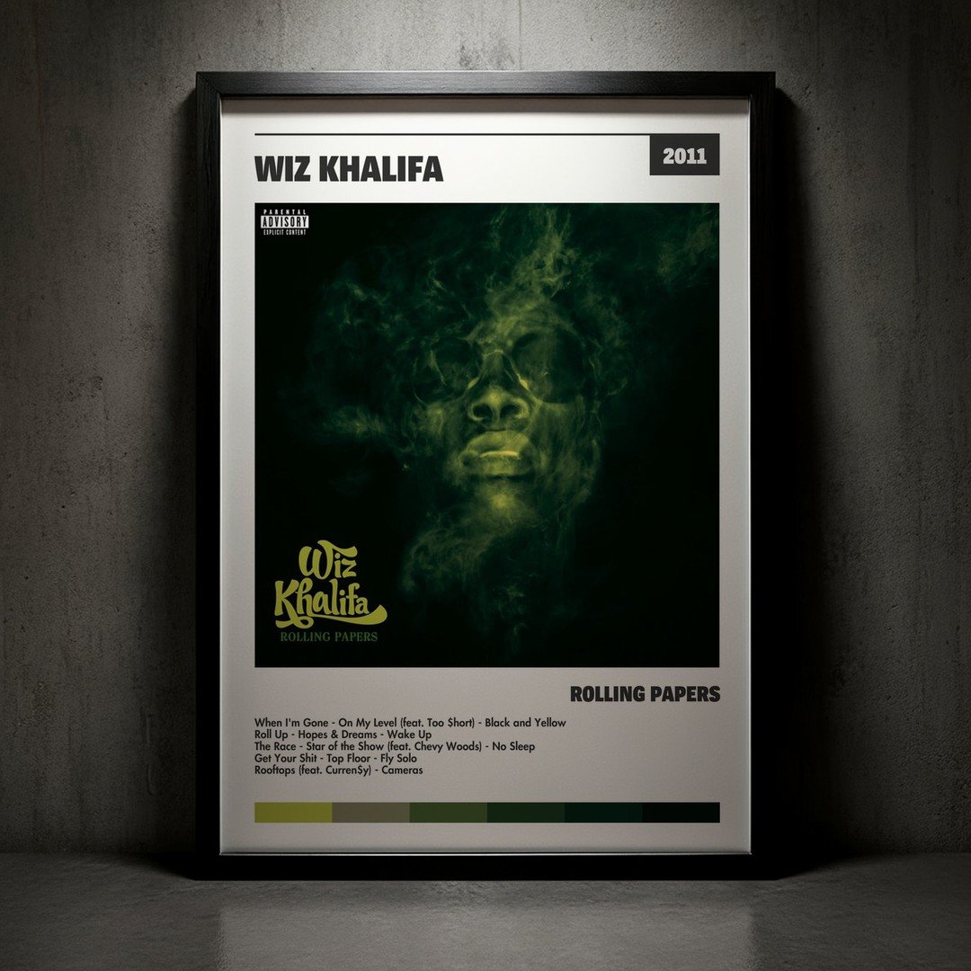 Nuestra colección de cuadros de Wiz Khalifa captura la esencia de sus álbumes más icónicos, presentados en un elegante estilo, en este caso te presentamos el de su disco Rolling Papers.