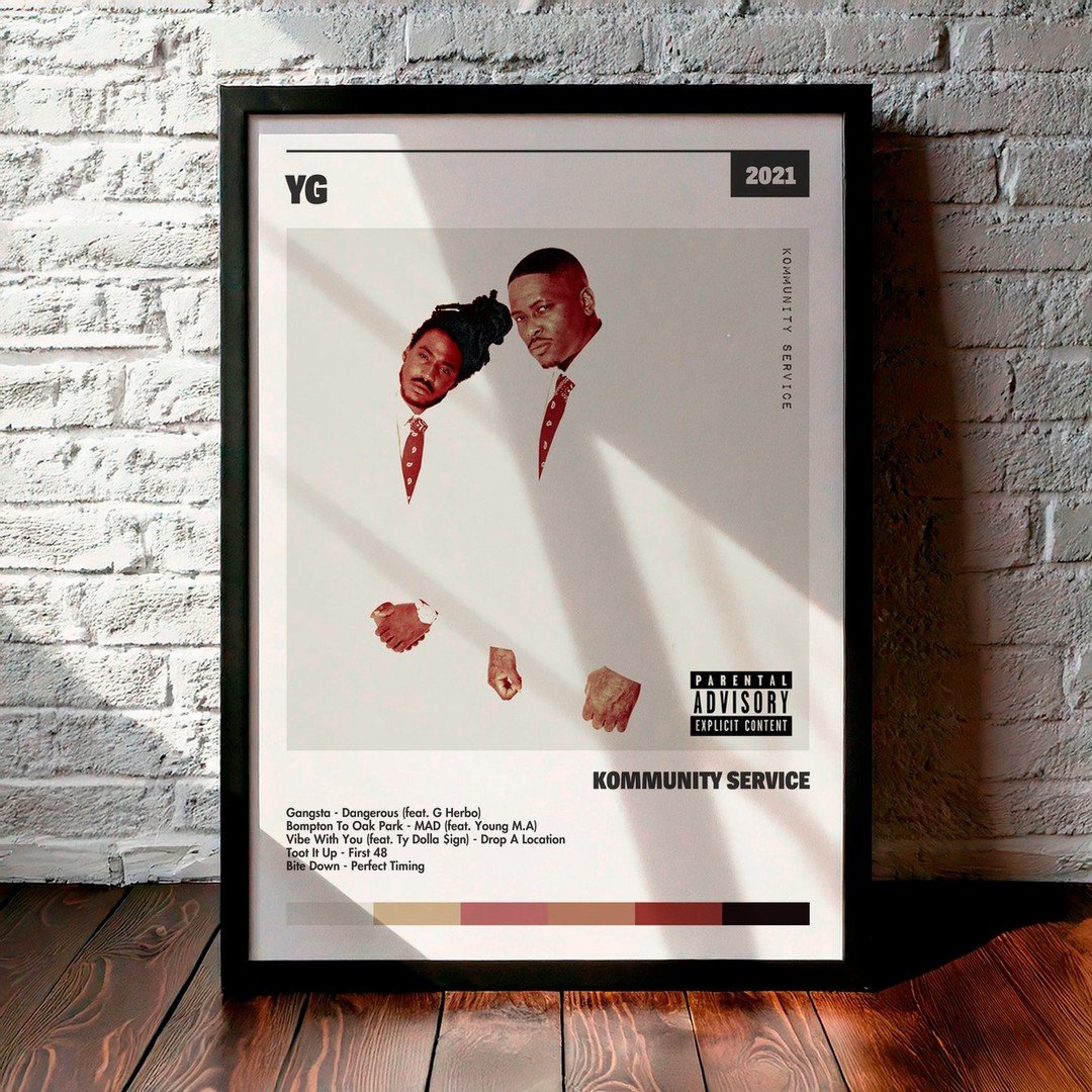 Nuestra colección de cuadros de YG captura la esencia de sus álbumes más icónicos, presentados en un elegante estilo, en este caso te presentamos el de su disco Kommunity Service.
