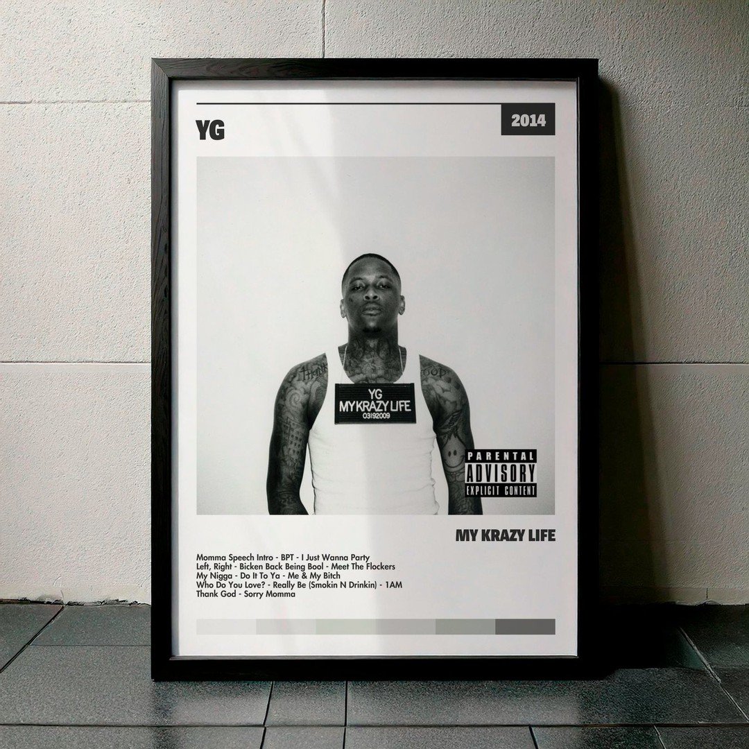 Nuestra colección de cuadros de YG captura la esencia de sus álbumes más icónicos, presentados en un elegante estilo, en este caso te presentamos el de su disco My Krazy Life.