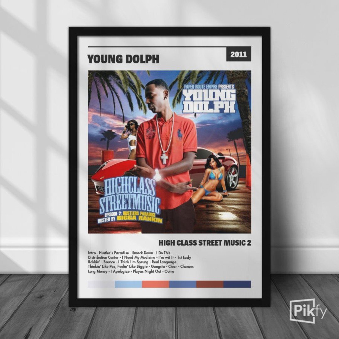 Nuestra colección de cuadros de Young Dolph captura la esencia de sus álbumes más icónicos, presentados en un elegante estilo, en este caso te presentamos el de su disco High Class Street Music 2.