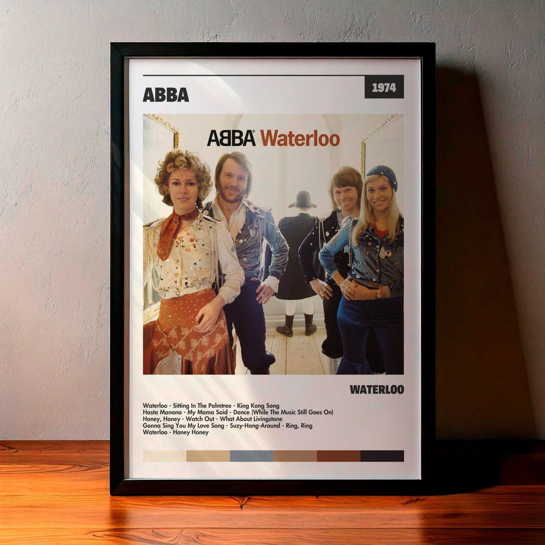 Nuestra colección de cuadros de ABBA captura la esencia de sus álbumes más icónicos, presentados en un elegante estilo, en este caso te presentamos el de su disco Waterloo.