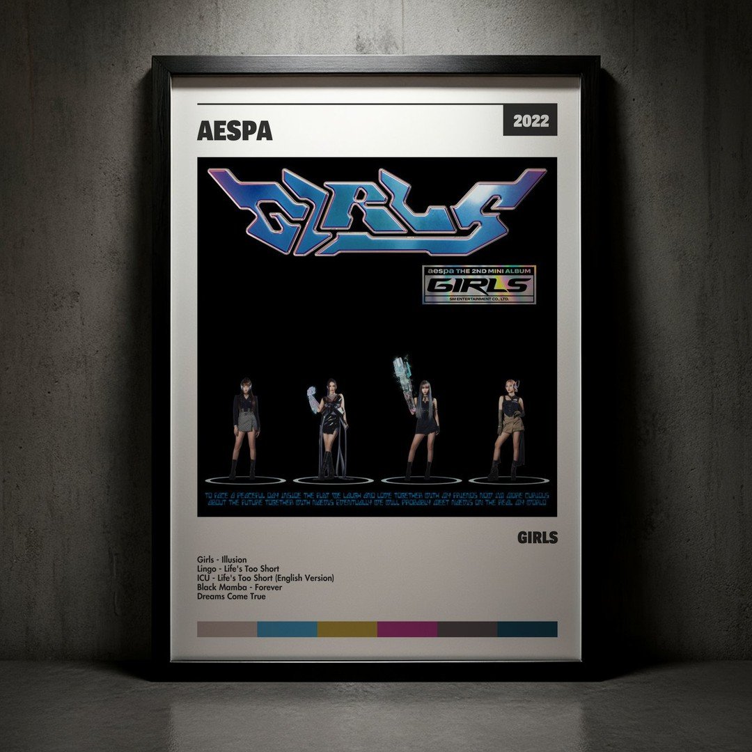 Nuestra colección de cuadros de aespa captura la esencia de sus álbumes más icónicos, presentados en un elegante estilo, en este caso te presentamos el de su disco Girls.