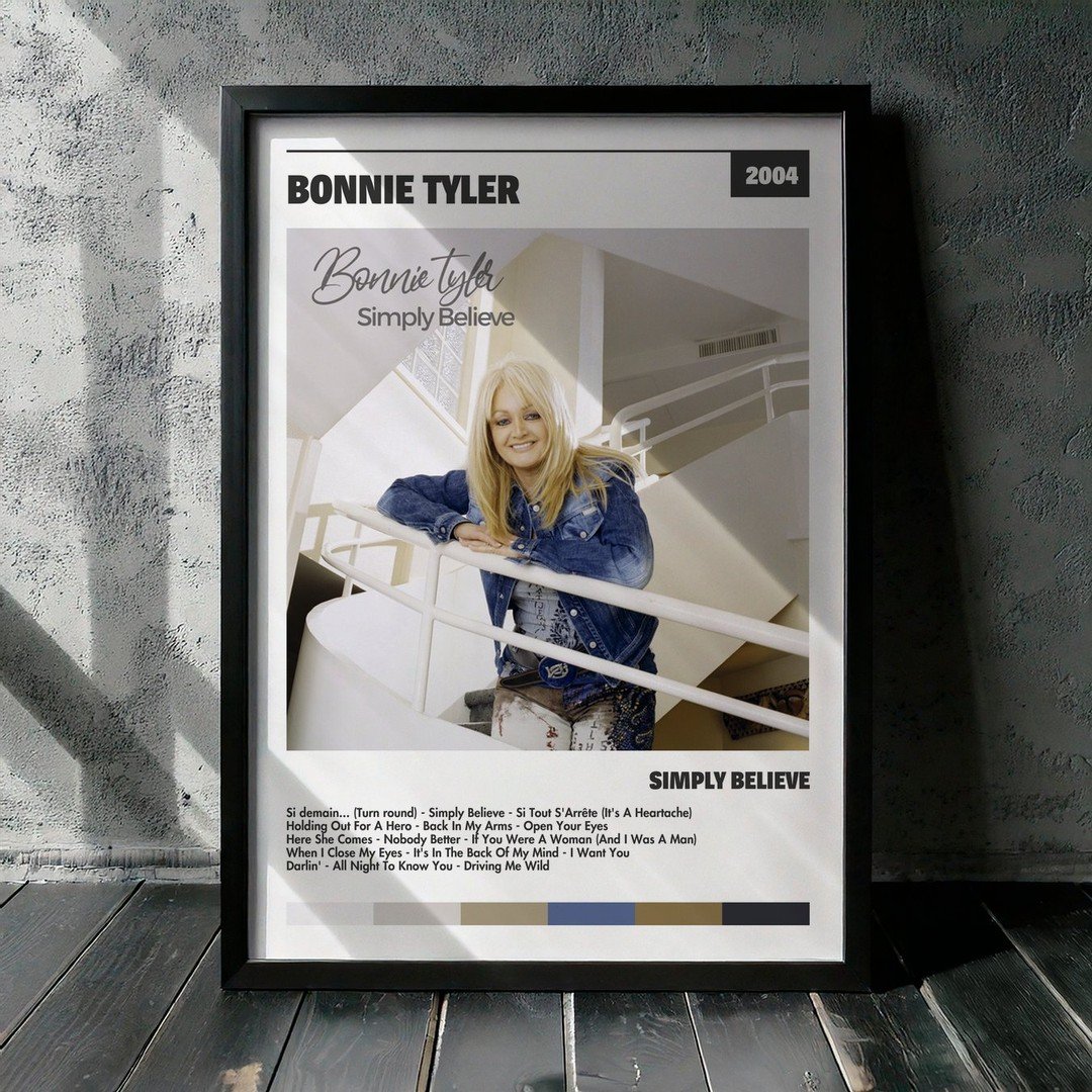 Nuestra colección de cuadros de Bonnie Tyler captura la esencia de sus álbumes más icónicos, presentados en un elegante estilo, en este caso te presentamos el de su disco Simply Believe.