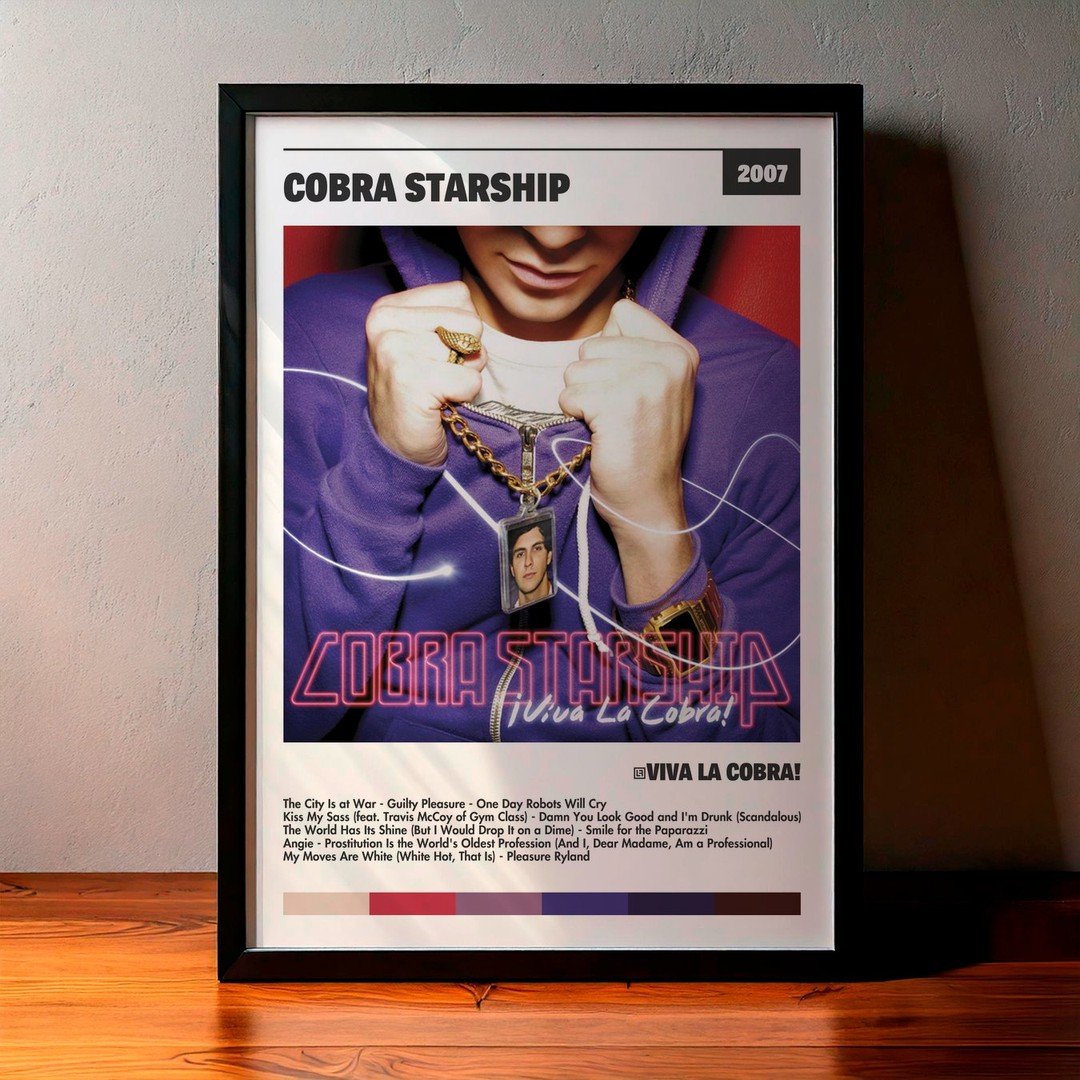 Nuestra colección de cuadros de Cobra Starship captura la esencia de sus álbumes más icónicos, presentados en un elegante estilo, en este caso te presentamos el de su disco ¡Viva la Cobra!.