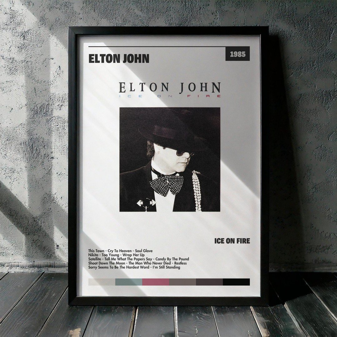 Nuestra colección de cuadros de Elton John captura la esencia de sus álbumes más icónicos, presentados en un elegante estilo, en este caso te presentamos el de su disco Ice On Fire.