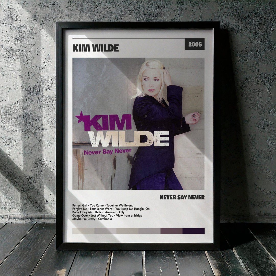 Nuestra colección de cuadros de Kim Wilde captura la esencia de sus álbumes más icónicos, presentados en un elegante estilo, en este caso te presentamos el de su disco Never Say Never.