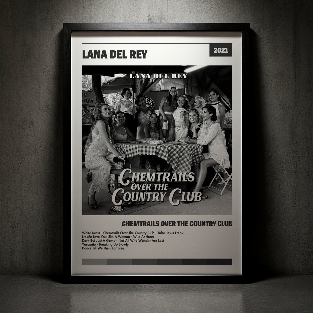 Nuestra colección de cuadros de Lana Del Rey captura la esencia de sus álbumes más icónicos, presentados en un elegante estilo, en este caso te presentamos el de su disco Chemtrails Over The Rock Club.