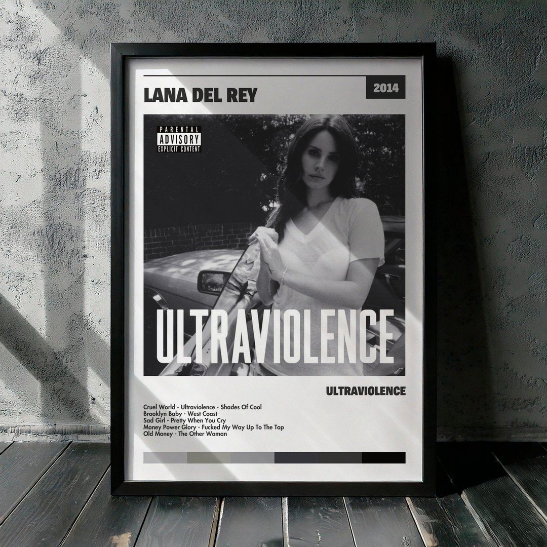 Nuestra colección de cuadros de Lana Del Rey captura la esencia de sus álbumes más icónicos, presentados en un elegante estilo, en este caso te presentamos el de su disco Ultraviolence.