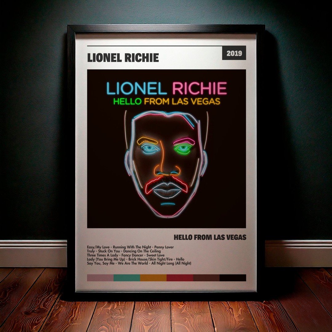 Nuestra colección de cuadros de Lionel Richie captura la esencia de sus álbumes más icónicos, presentados en un elegante estilo, en este caso te presentamos el de su disco Hello From Las Vegas.