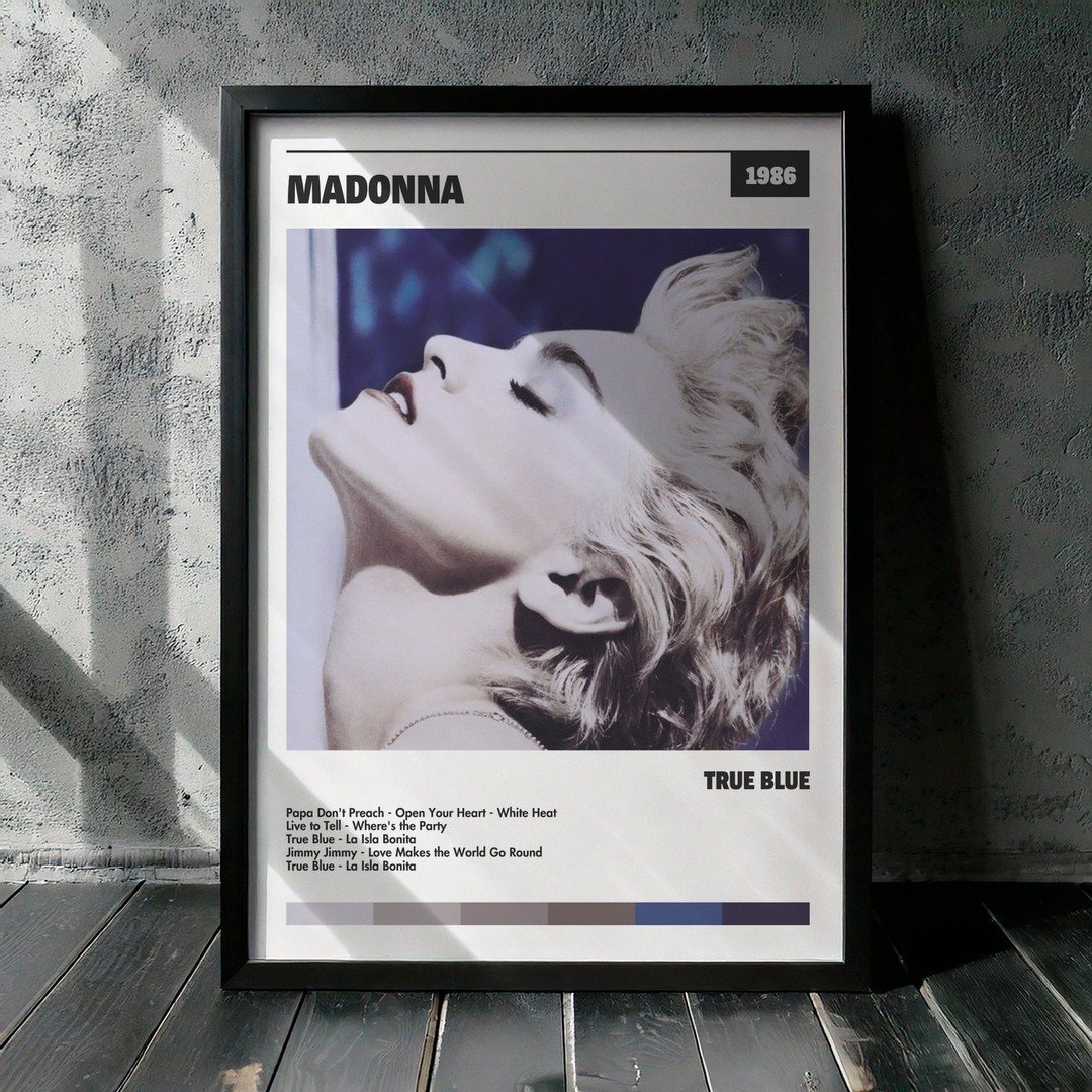 Nuestra colección de cuadros de Madonna captura la esencia de sus álbumes más icónicos, presentados en un elegante estilo, en este caso te presentamos el de su disco True Blue.