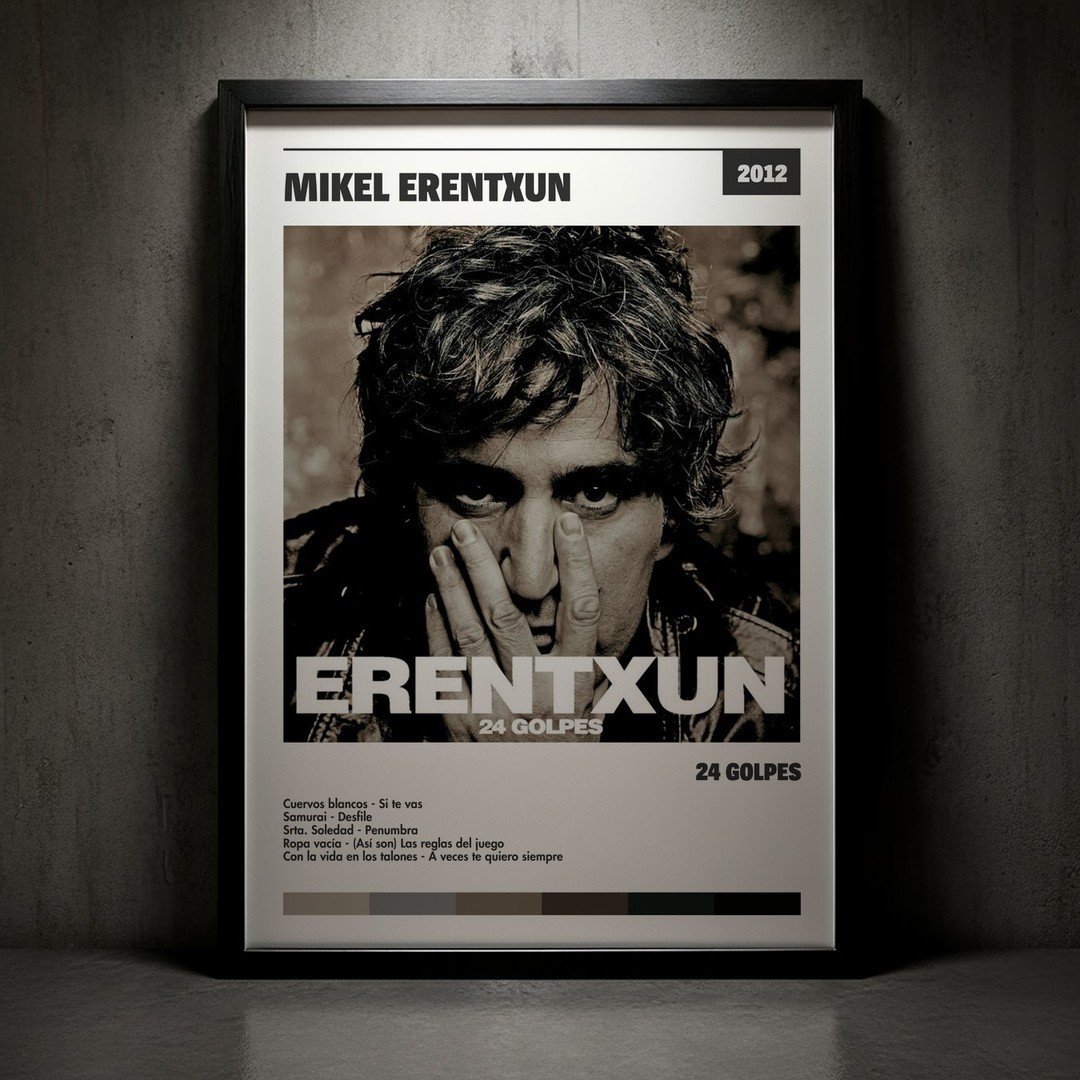 Nuestra colección de cuadros de Mikel Erentxun captura la esencia de sus álbumes más icónicos, presentados en un elegante estilo, en este caso te presentamos el de su disco 24 Golpes.