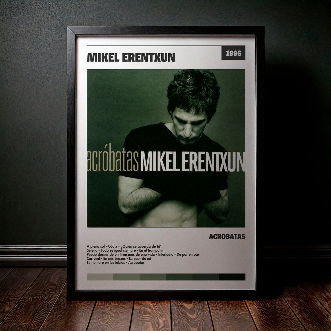 Nuestra colección de cuadros de Mikel Erentxun captura la esencia de sus álbumes más icónicos, presentados en un elegante estilo, en este caso te presentamos el de su disco Acrobatas.
