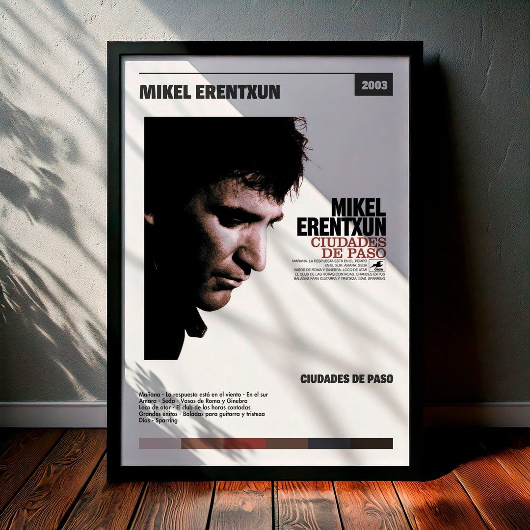 Nuestra colección de cuadros de Mikel Erentxun captura la esencia de sus álbumes más icónicos, presentados en un elegante estilo, en este caso te presentamos el de su disco Ciudades de paso.