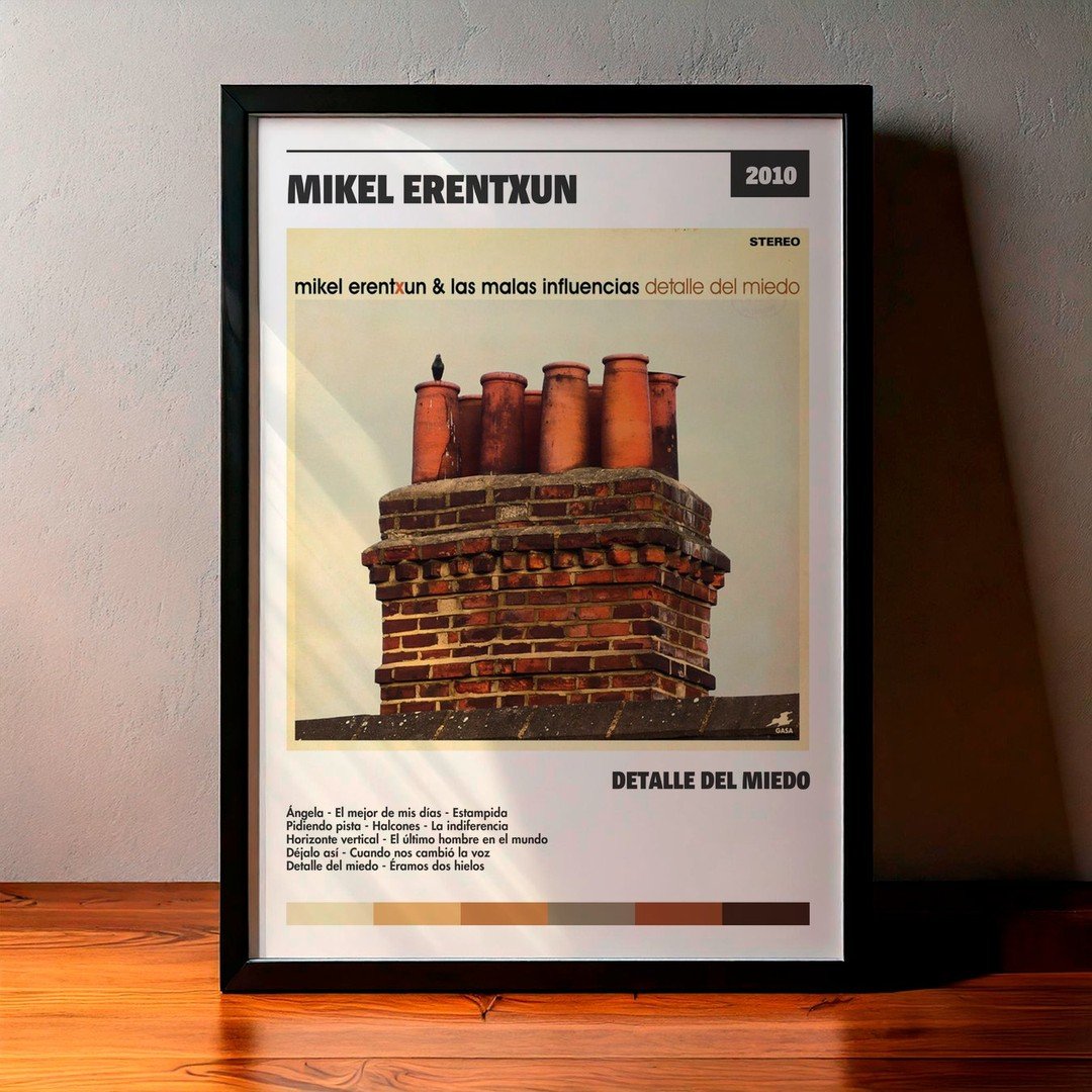 Nuestra colección de cuadros de Mikel Erentxun captura la esencia de sus álbumes más icónicos, presentados en un elegante estilo, en este caso te presentamos el de su disco Detalle del miedo.