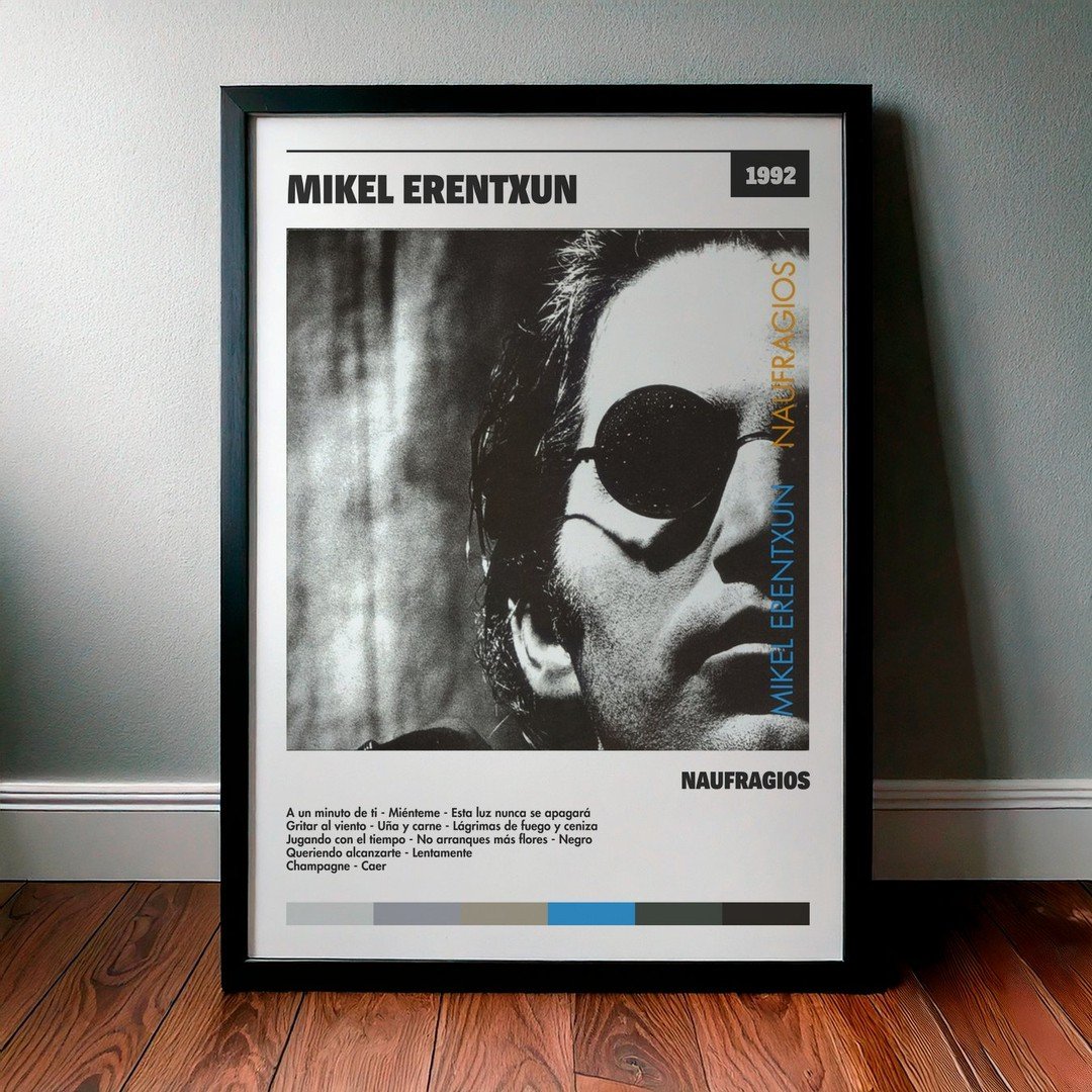 Nuestra colección de cuadros de Mikel Erentxun captura la esencia de sus álbumes más icónicos, presentados en un elegante estilo, en este caso te presentamos el de su disco Naufragios.