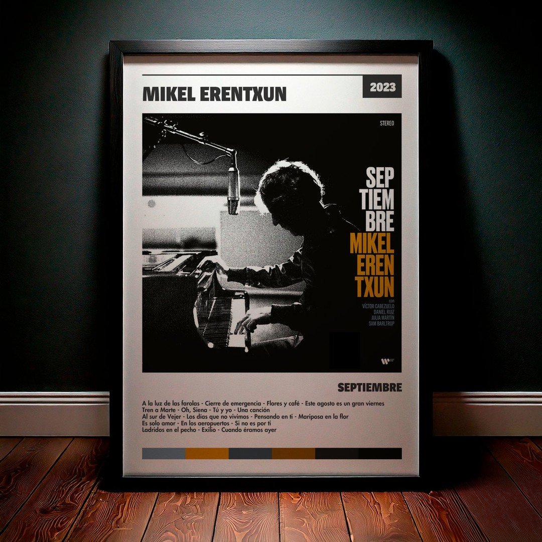 Nuestra colección de cuadros de Mikel Erentxun captura la esencia de sus álbumes más icónicos, presentados en un elegante estilo, en este caso te presentamos el de su disco Septiembre.