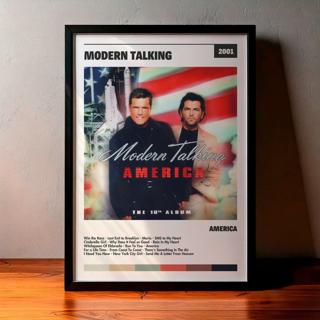 Nuestra colección de cuadros de Modern Talking captura la esencia de sus álbumes más icónicos, presentados en un elegante estilo, en este caso te presentamos el de su disco America.