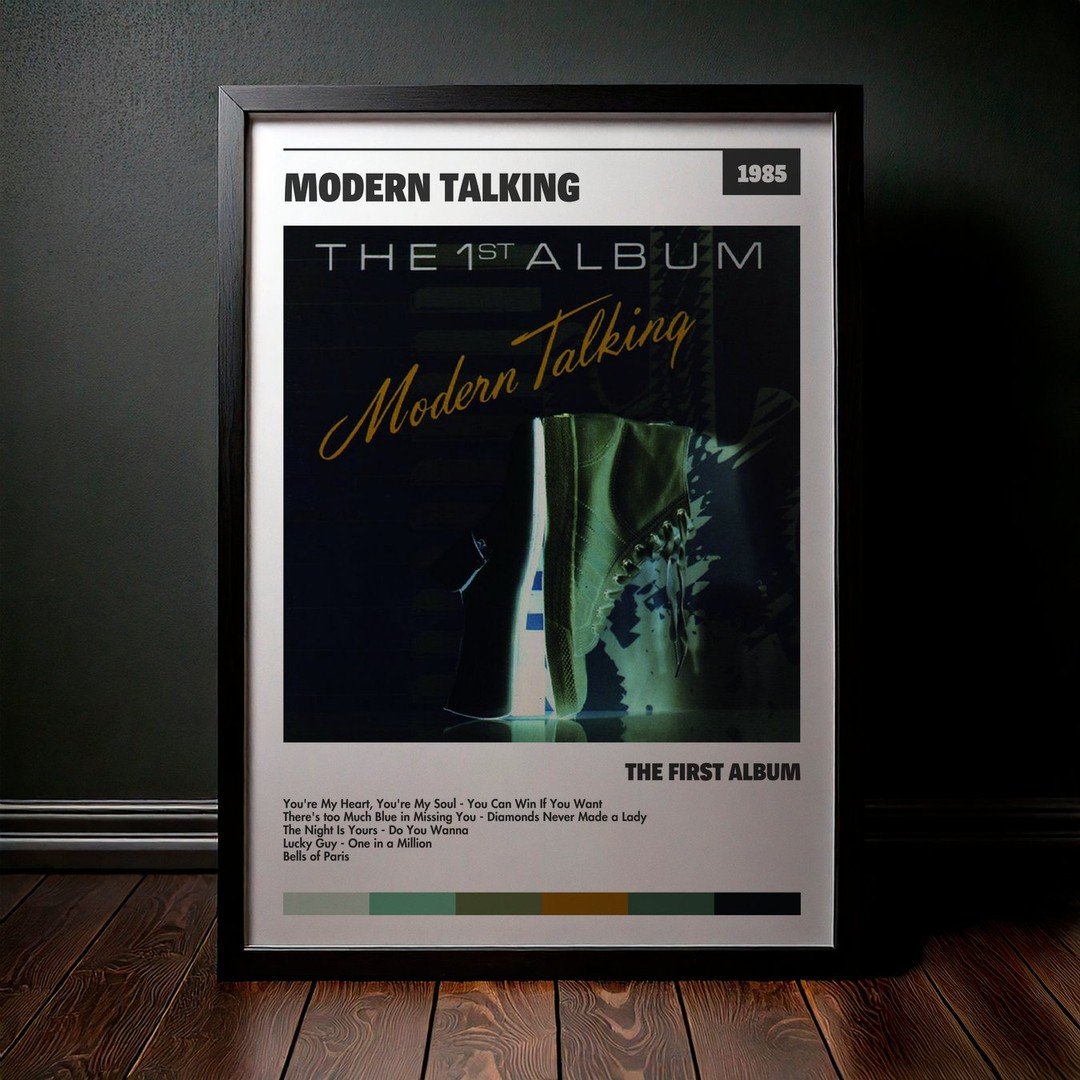 Nuestra colección de cuadros de Modern Talking captura la esencia de sus álbumes más icónicos, presentados en un elegante estilo, en este caso te presentamos el de su disco The First Album.