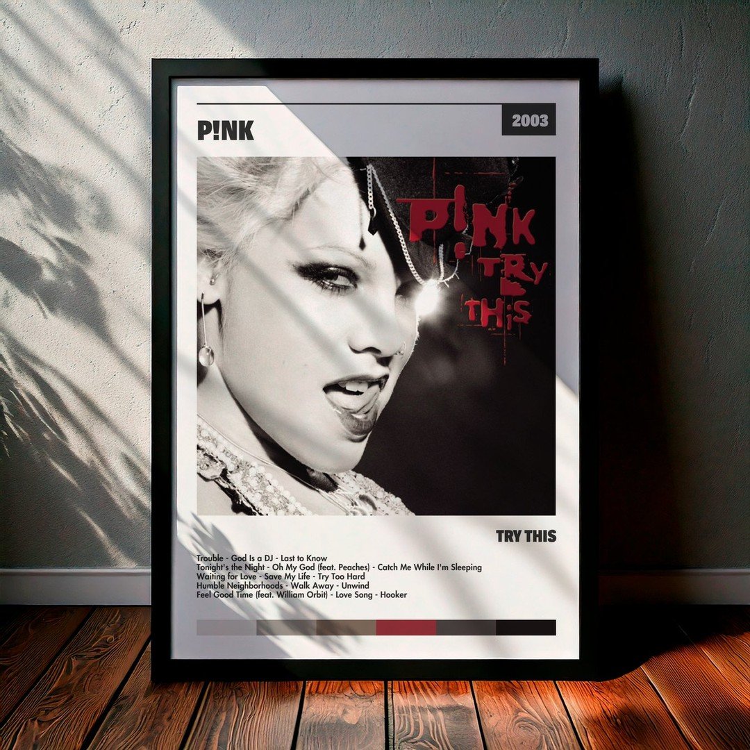 Nuestra colección de cuadros de P!nk captura la esencia de sus álbumes más icónicos, presentados en un elegante estilo, en este caso te presentamos el de su disco Try This.