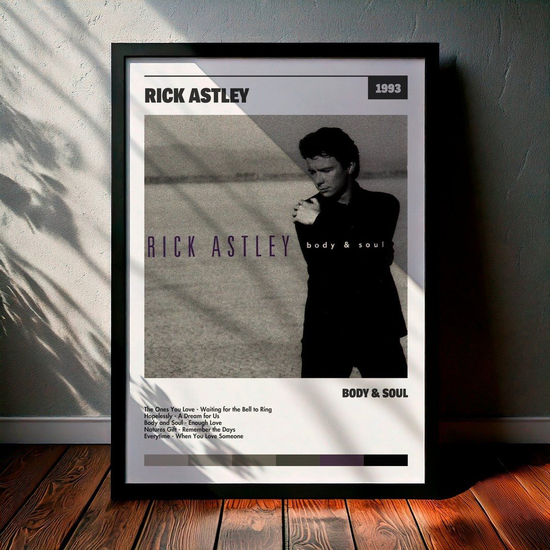Nuestra colección de cuadros de Rick Astley captura la esencia de sus álbumes más icónicos, presentados en un elegante estilo, en este caso te presentamos el de su disco Body & Disco.