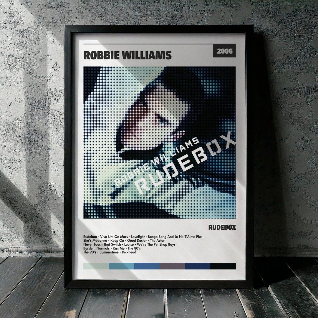 Nuestra colección de cuadros de Robbie Williams captura la esencia de sus álbumes más icónicos, presentados en un elegante estilo, en este caso te presentamos el de su disco Rudebox.