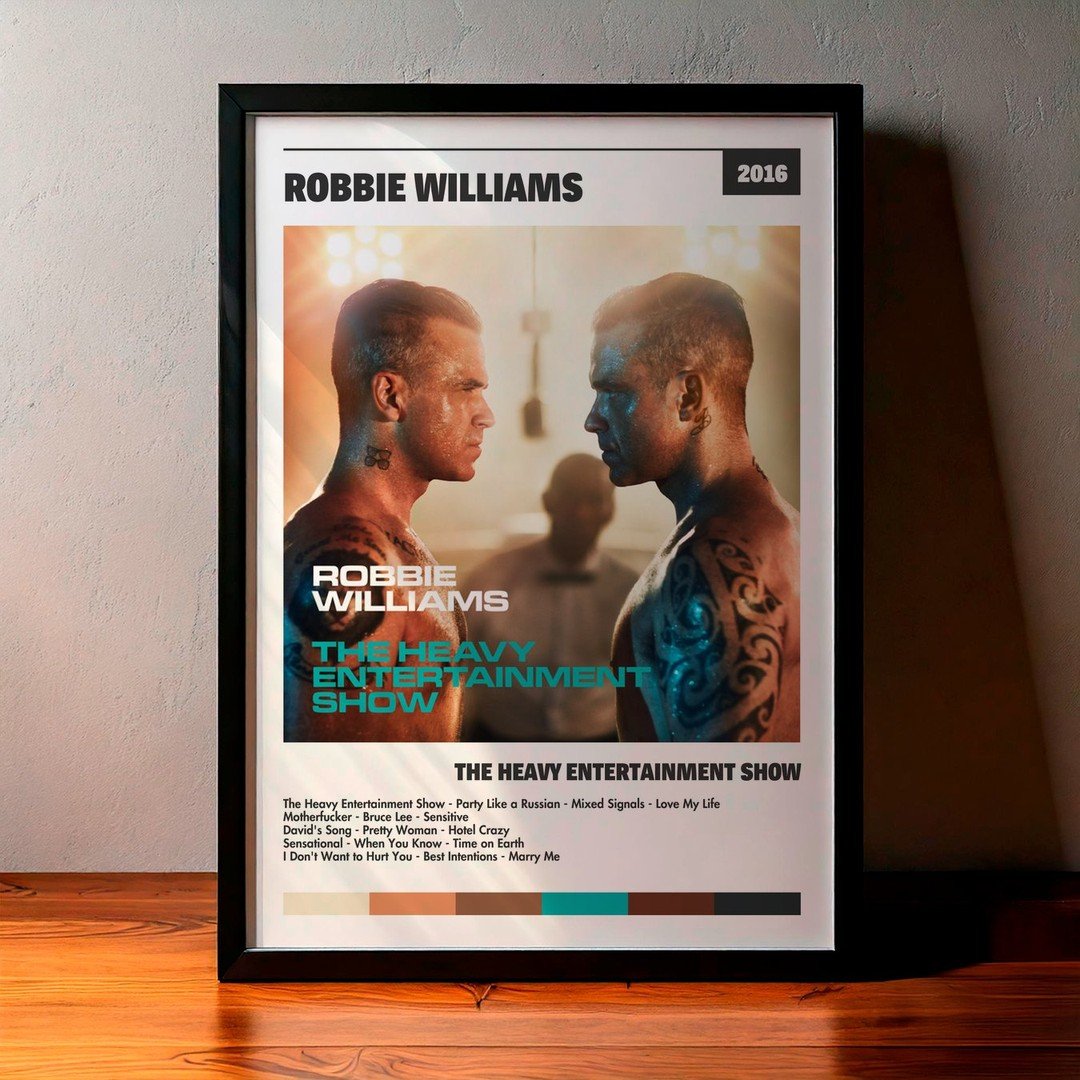 Nuestra colección de cuadros de Robbie Williams captura la esencia de sus álbumes más icónicos, presentados en un elegante estilo, en este caso te presentamos el de su disco The Heavy Entertainment Show.