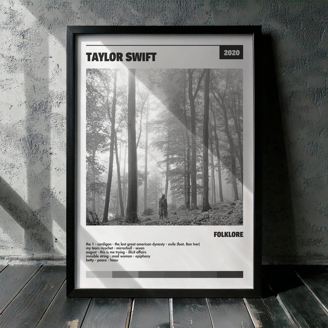 Nuestra colección de cuadros de Taylor Swift captura la esencia de sus álbumes más icónicos, presentados en un elegante estilo, en este caso te presentamos el de su disco folklore.