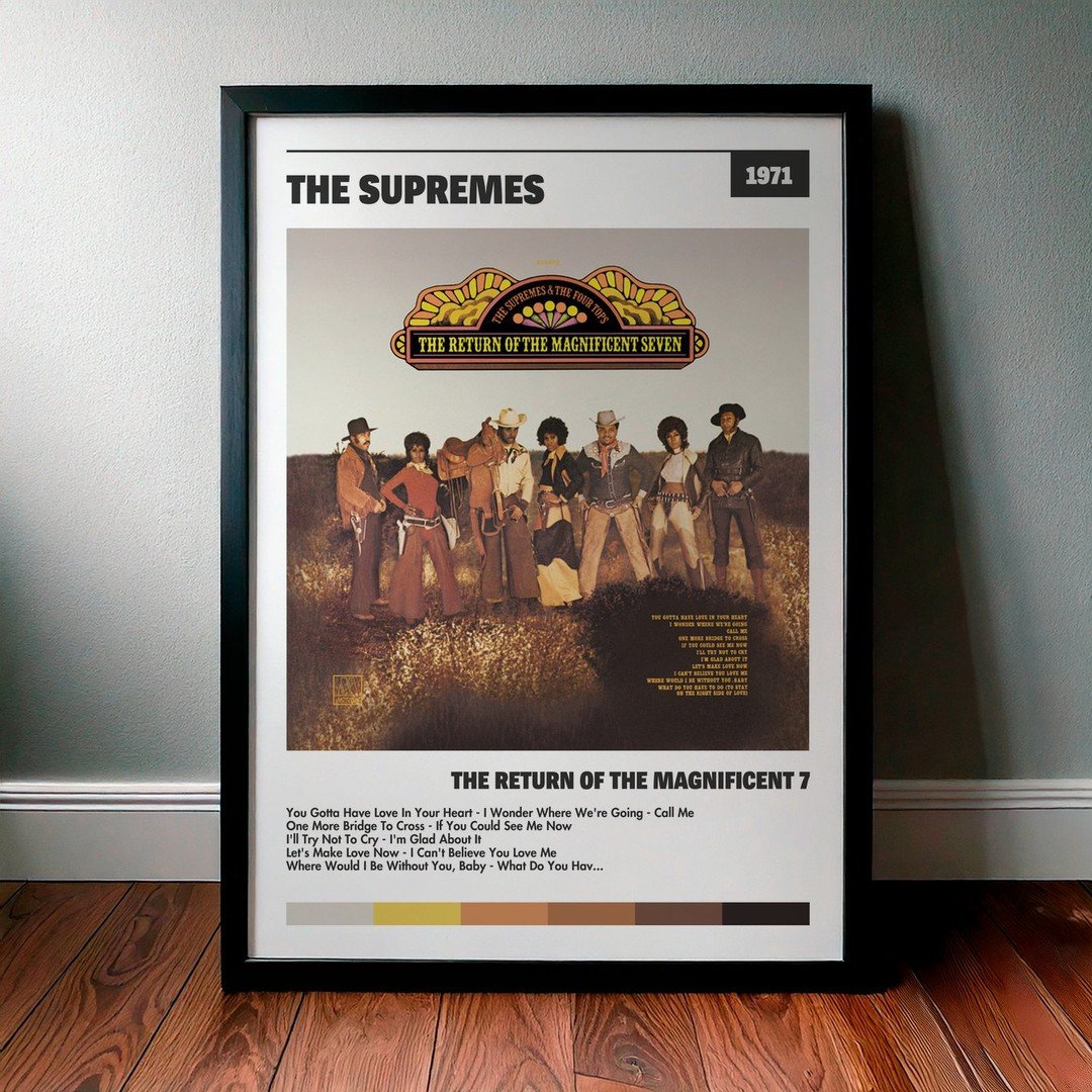 Nuestra colección de cuadros de The Supremes captura la esencia de sus álbumes más icónicos, presentados en un elegante estilo, en este caso te presentamos el de su disco The Return Of The Magnificent 7.