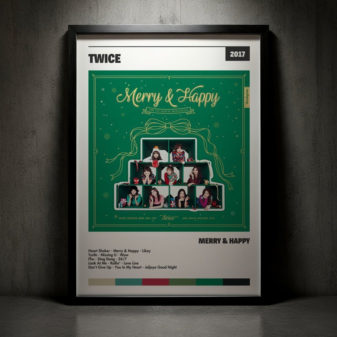 • Diseño Exclusivo: Cuadro de alta calidad basado en la portada del álbum Merry & Happy de TWICE.