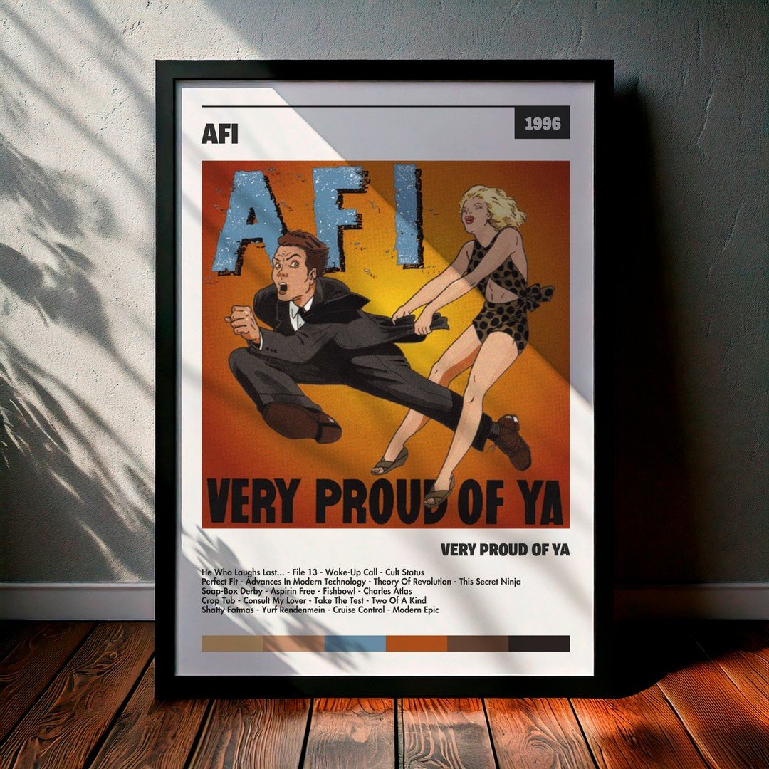 Nuestra colección de cuadros de AFI captura la esencia de sus álbumes más icónicos, presentados en un elegante estilo, en este caso te presentamos el de su disco Very Proud of Ya.