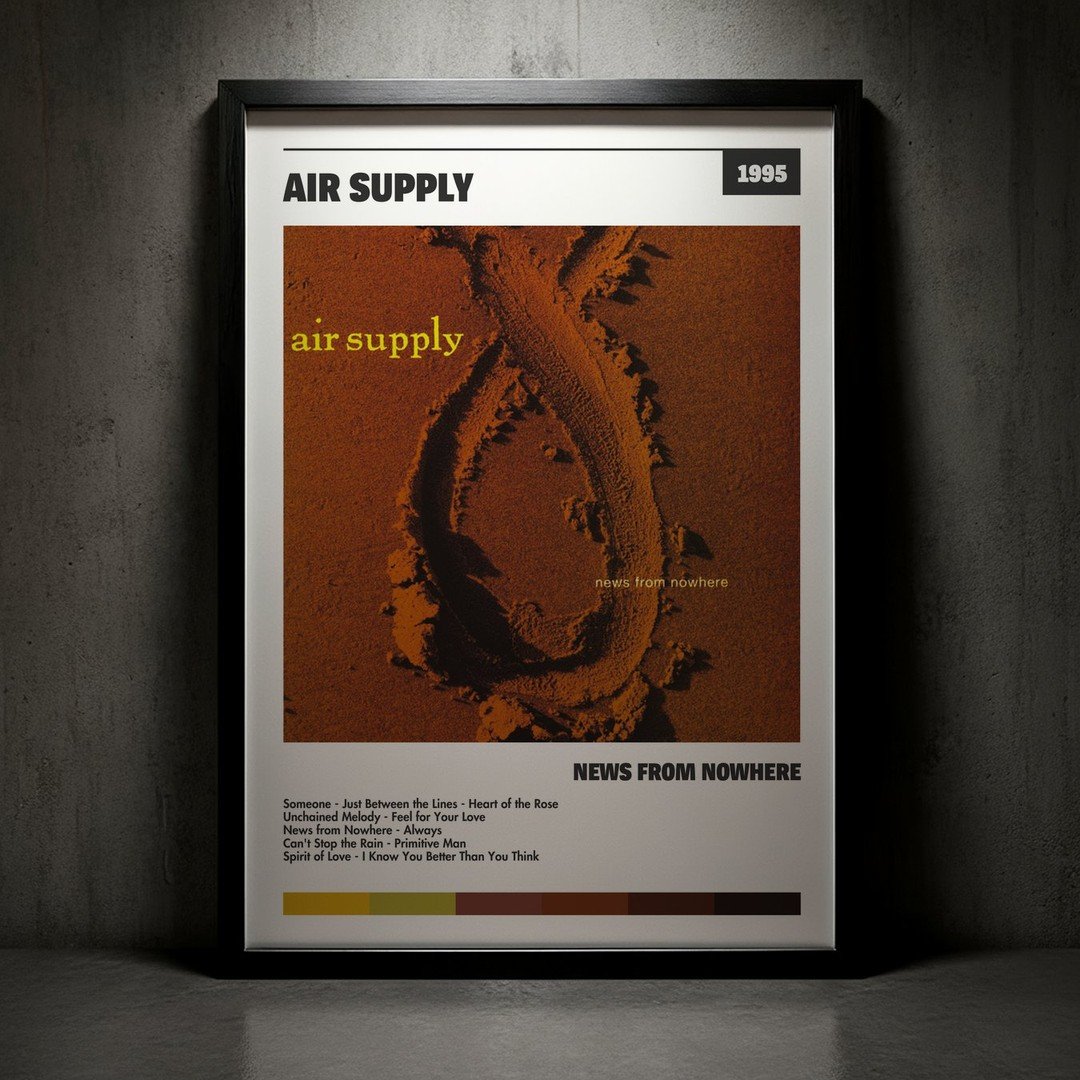 Nuestra colección de cuadros de Air Supply captura la esencia de sus álbumes más icónicos, presentados en un elegante estilo, en este caso te presentamos el de su disco News From Nowhere.