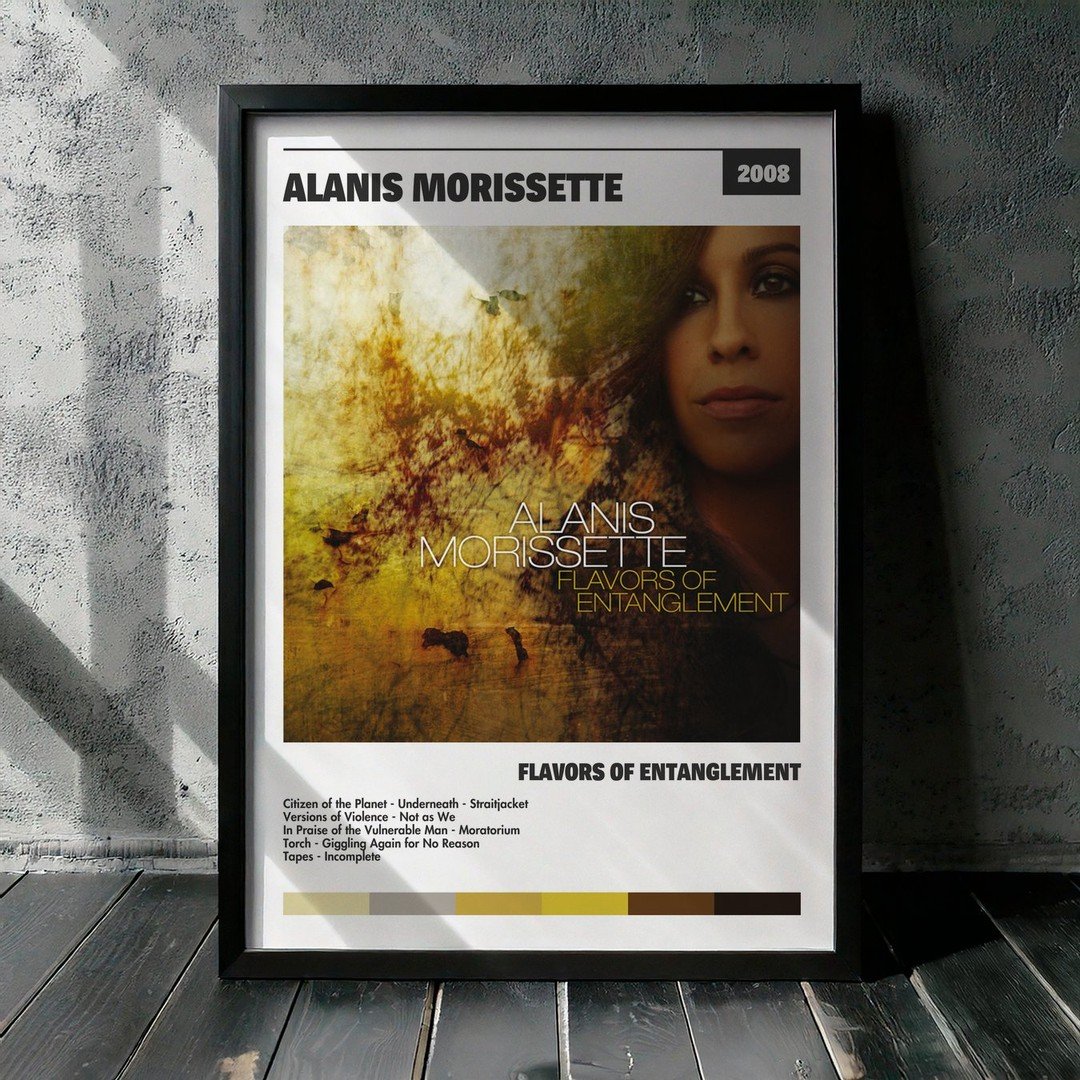 Nuestra colección de cuadros de Alanis Morissette captura la esencia de sus álbumes más icónicos, presentados en un elegante estilo, en este caso te presentamos el de su disco Flavors of Entanglement.