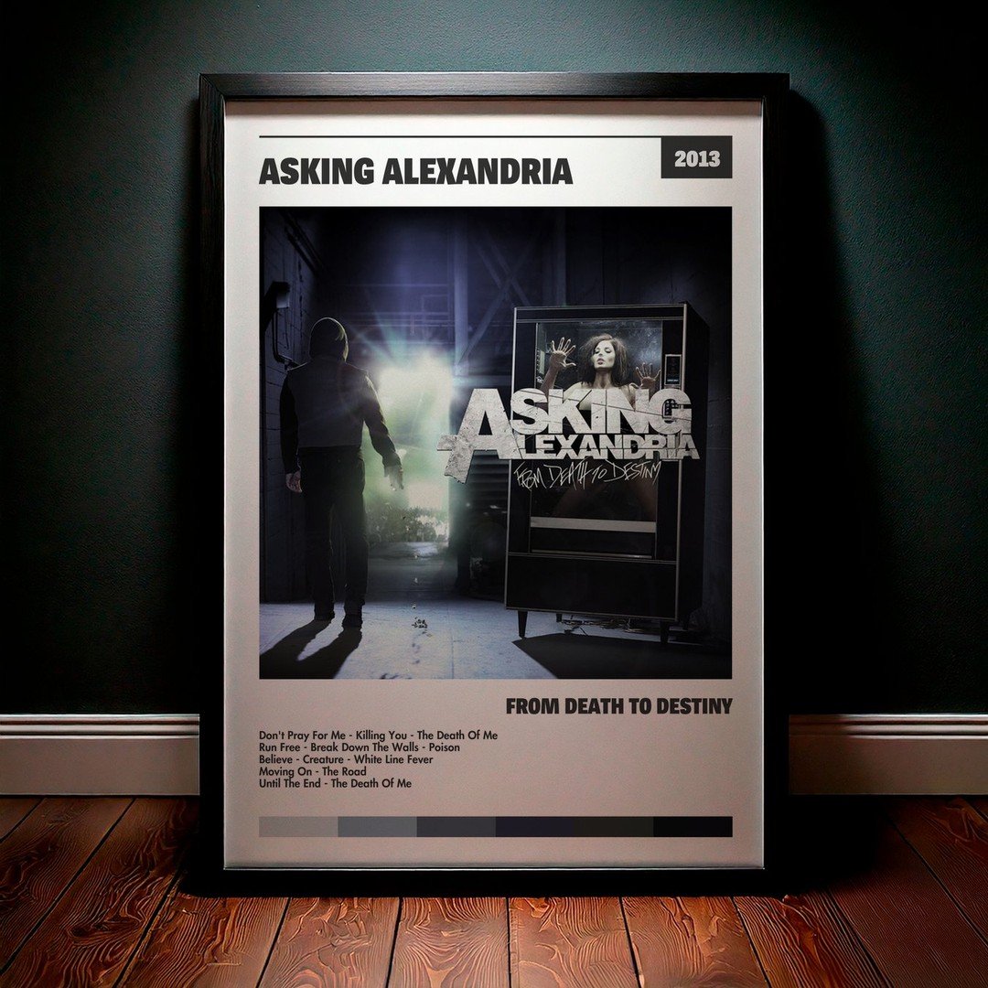 Nuestra colección de cuadros de Asking Alexandria captura la esencia de sus álbumes más icónicos, presentados en un elegante estilo, en este caso te presentamos el de su disco From Death To Destiny.