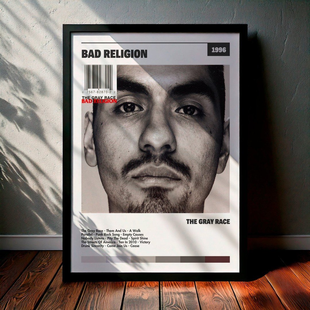 Nuestra colección de cuadros de Bad Religion captura la esencia de sus álbumes más icónicos, presentados en un elegante estilo, en este caso te presentamos el de su disco The Gray Race.