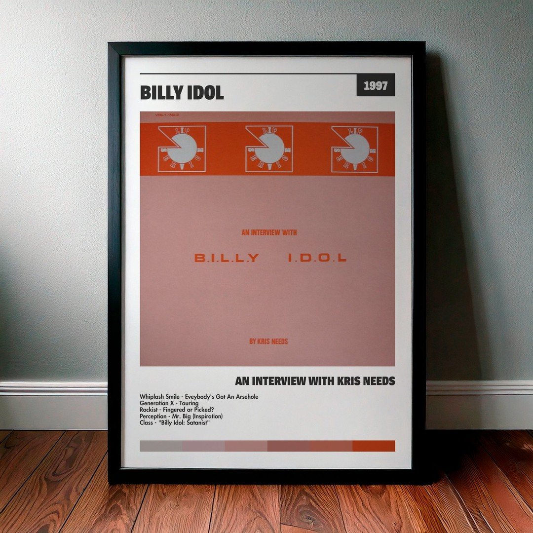 Nuestra colección de cuadros de Billy Idol captura la esencia de sus álbumes más icónicos, presentados en un elegante estilo, en este caso te presentamos el de su disco An Interview with Kris Needs.
