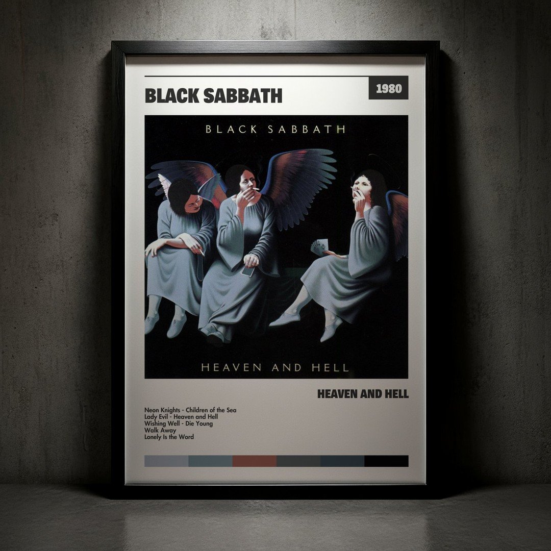 Nuestra colección de cuadros de Black Sabbath captura la esencia de sus álbumes más icónicos, presentados en un elegante estilo, en este caso te presentamos el de su disco Heaven and Hell.
