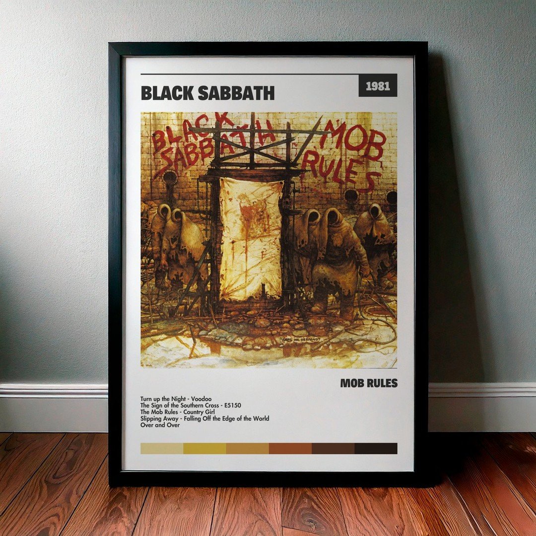Nuestra colección de cuadros de Black Sabbath captura la esencia de sus álbumes más icónicos, presentados en un elegante estilo, en este caso te presentamos el de su disco Mob Rules.