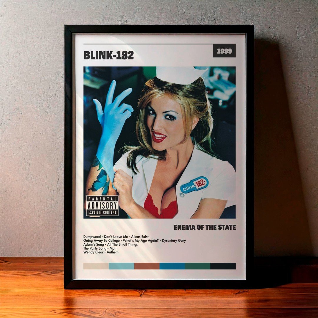 Nuestra colección de cuadros de blink-182 captura la esencia de sus álbumes más icónicos, presentados en un elegante estilo, en este caso te presentamos el de su disco Enema Of The State.