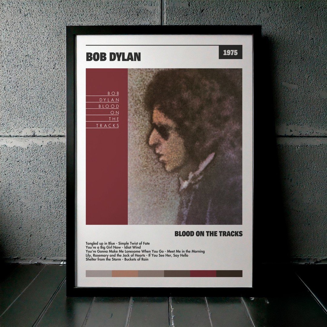 Nuestra colección de cuadros de Bob Dylan captura la esencia de sus álbumes más icónicos, presentados en un elegante estilo, en este caso te presentamos el de su disco Blood On The Tracks.