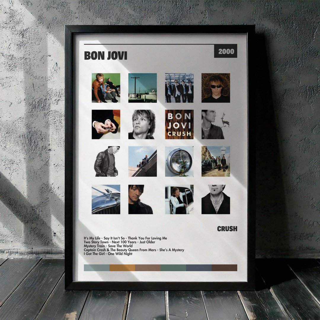 Nuestra colección de cuadros de Bon Jovi captura la esencia de sus álbumes más icónicos, presentados en un elegante estilo, en este caso te presentamos el de su disco Crush.