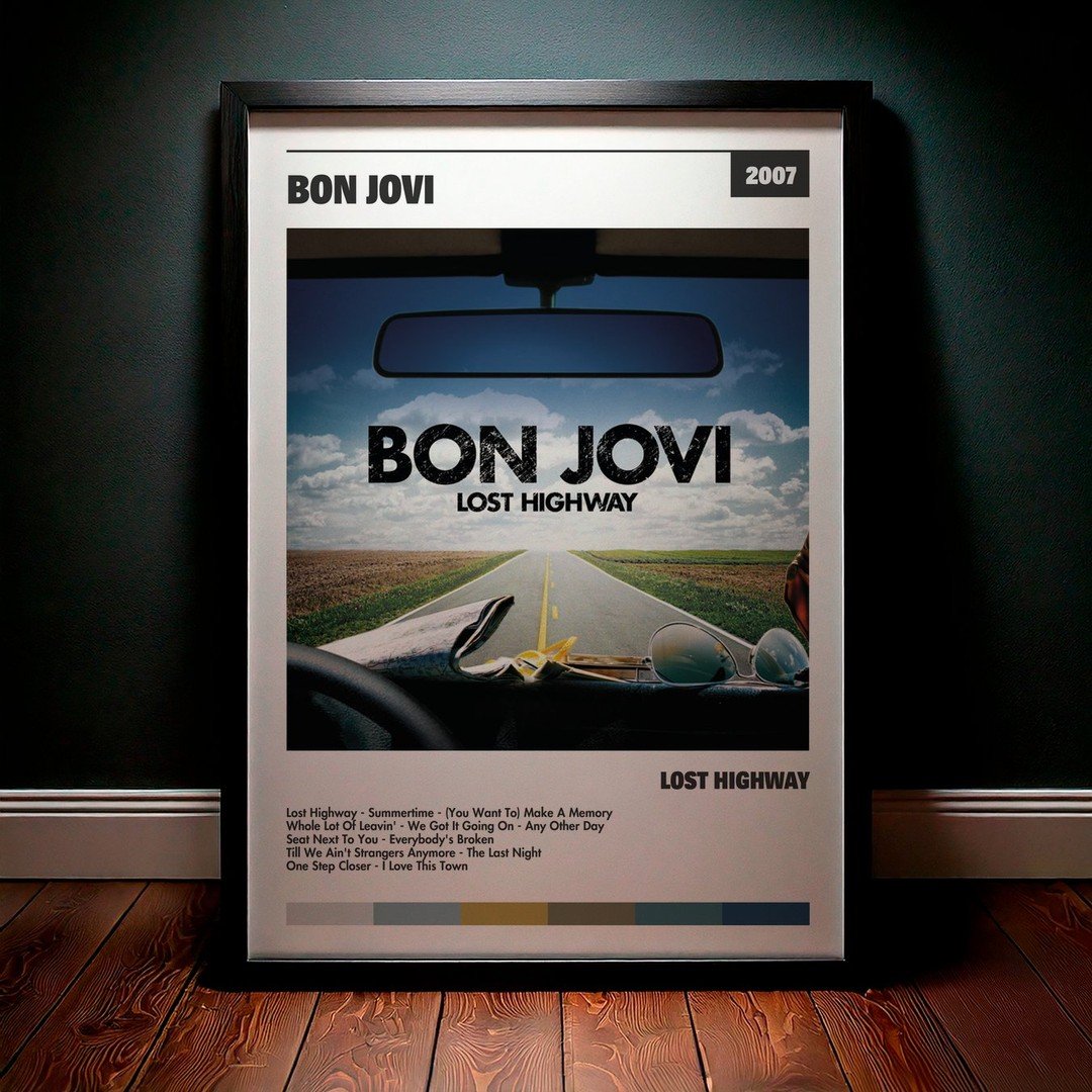 Nuestra colección de cuadros de Bon Jovi captura la esencia de sus álbumes más icónicos, presentados en un elegante estilo, en este caso te presentamos el de su disco Lost Highway.