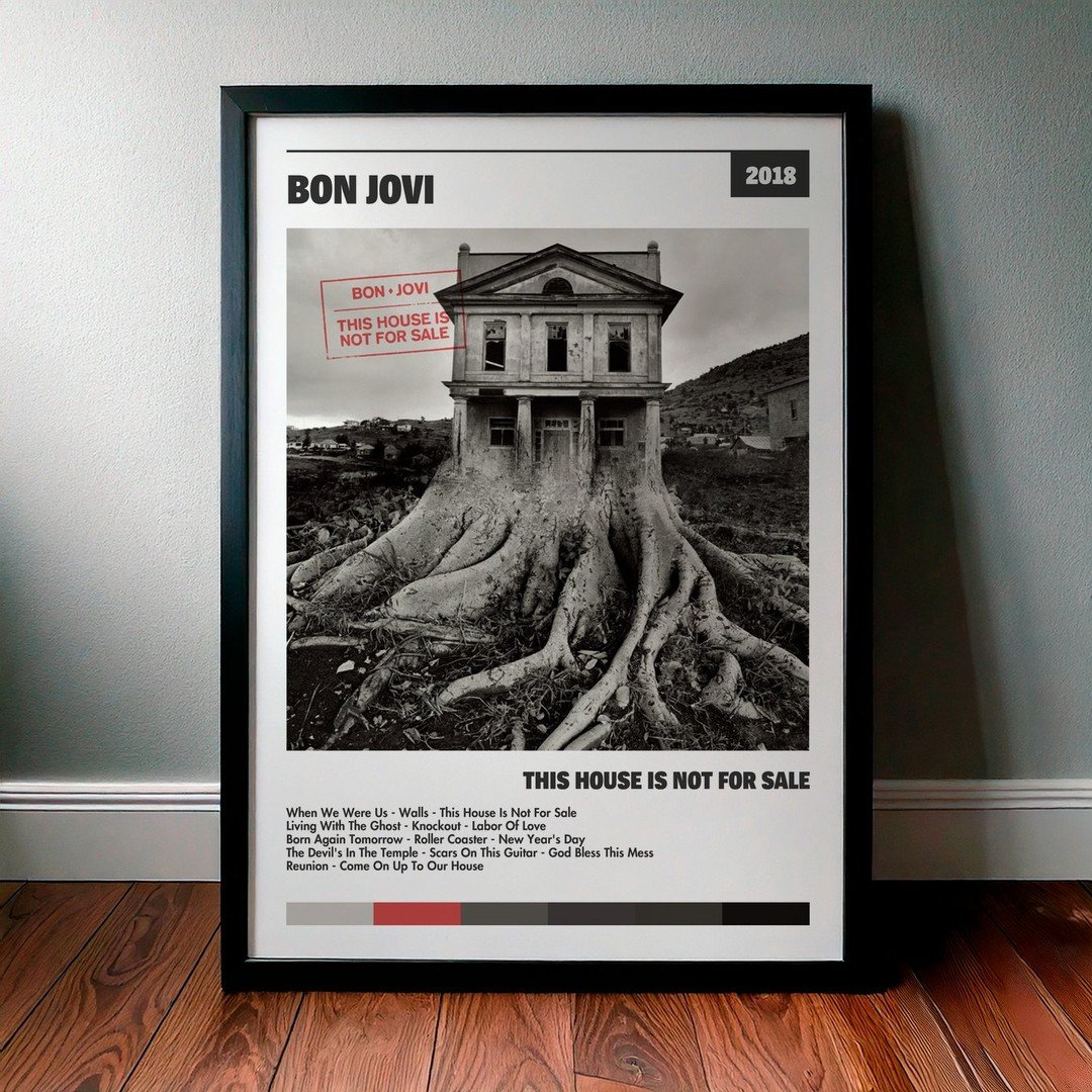 Nuestra colección de cuadros de Bon Jovi captura la esencia de sus álbumes más icónicos, presentados en un elegante estilo, en este caso te presentamos el de su disco This House Is Not For Sale.