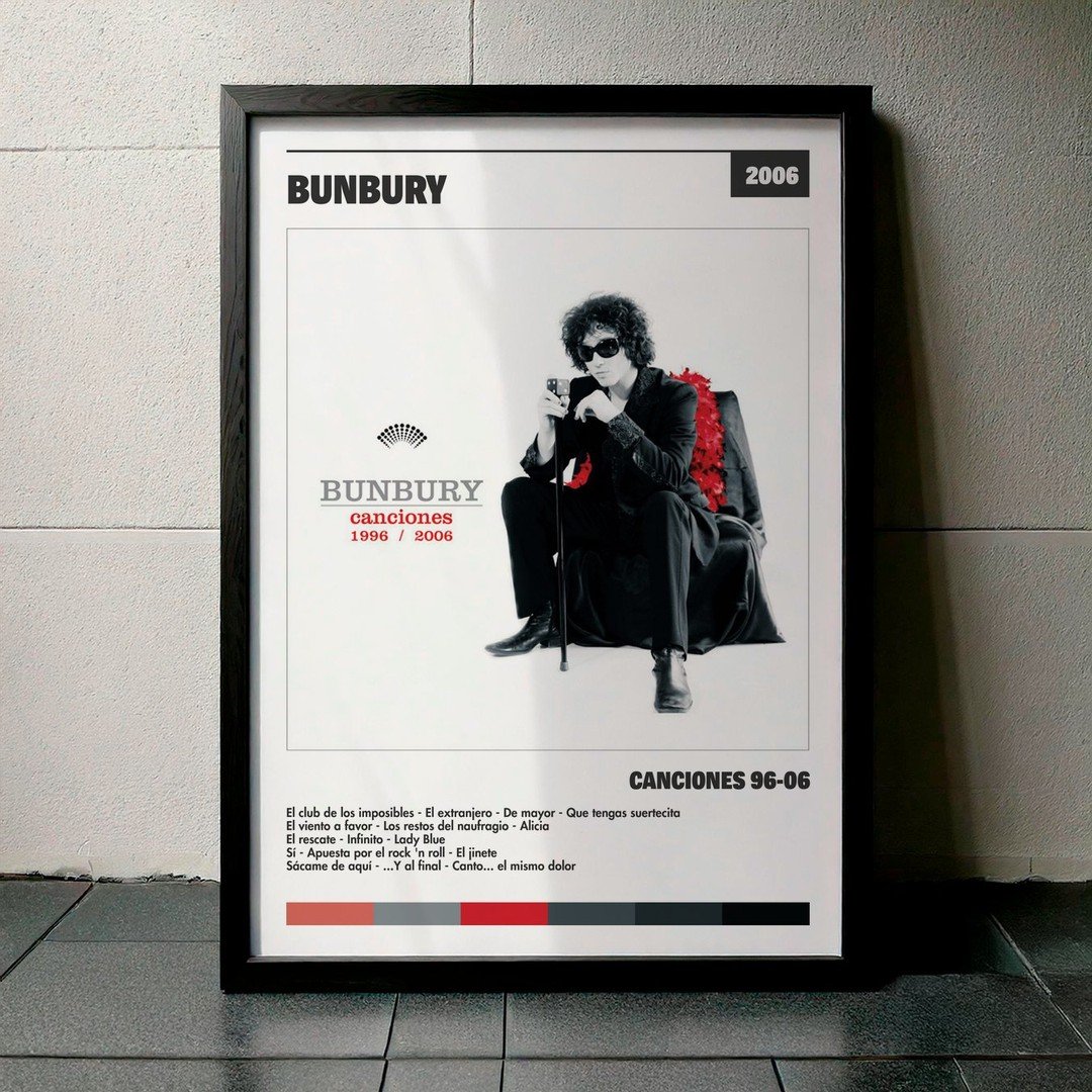 Nuestra colección de cuadros de Bunbury captura la esencia de sus álbumes más icónicos, presentados en un elegante estilo, en este caso te presentamos el de su disco Canciones 96-06.