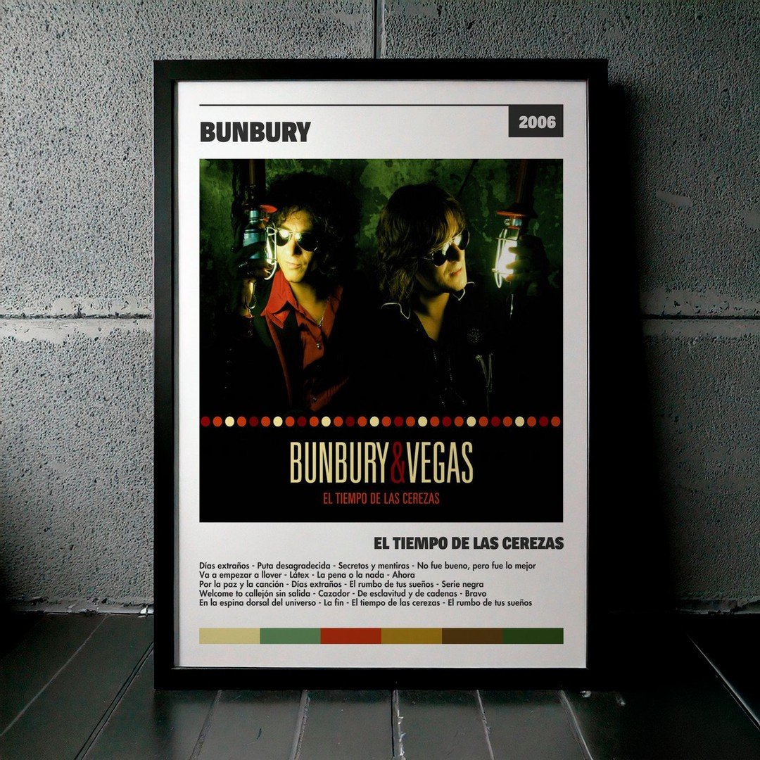 Nuestra colección de cuadros de Bunbury captura la esencia de sus álbumes más icónicos, presentados en un elegante estilo, en este caso te presentamos el de su disco El Tiempo De Las Cerezas.