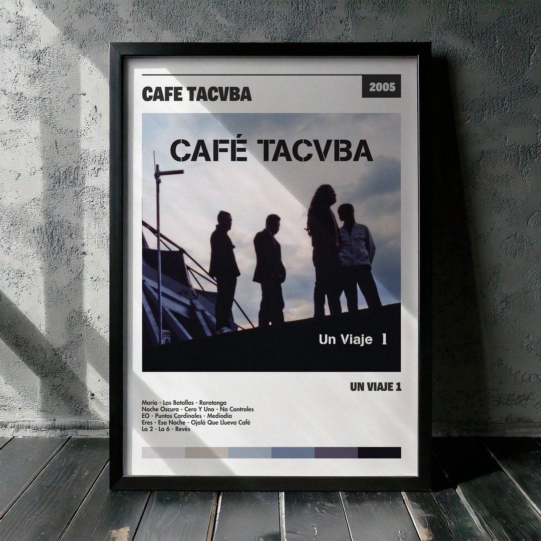 Nuestra colección de cuadros de Café Tacvba captura la esencia de sus álbumes más icónicos, presentados en un elegante estilo, en este caso te presentamos el de su disco Un Viaje 1.