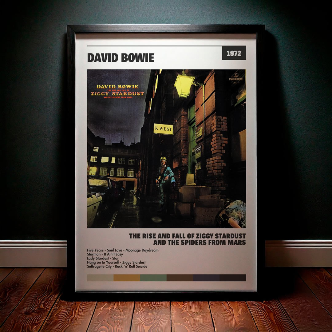 Nuestra colección de cuadros de David Bowie captura la esencia de sus álbumes más icónicos, presentados en un elegante estilo, en este caso te presentamos el de su disco The Rise And Fall Of Ziggy Stardust And The Spiders From Mars