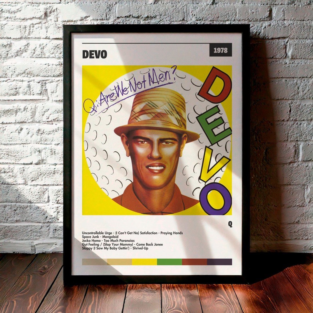 Nuestra colección de cuadros de DEVO captura la esencia de sus álbumes más icónicos, presentados en un elegante estilo, en este caso te presentamos el de su disco Q.