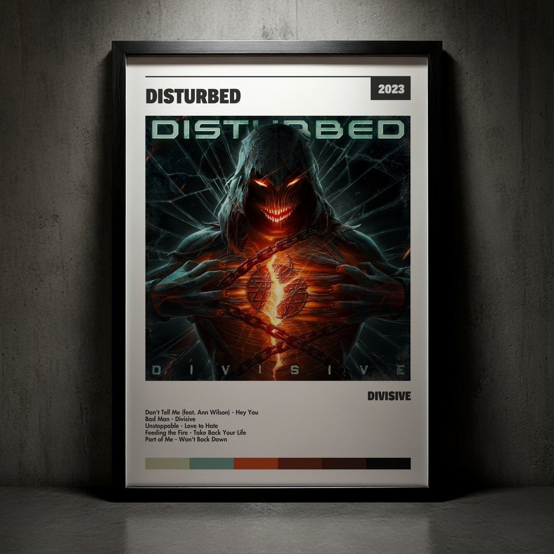 Nuestra colección de cuadros de Disturbed captura la esencia de sus álbumes más icónicos, presentados en un elegante estilo, en este caso te presentamos el de su disco Divisive.