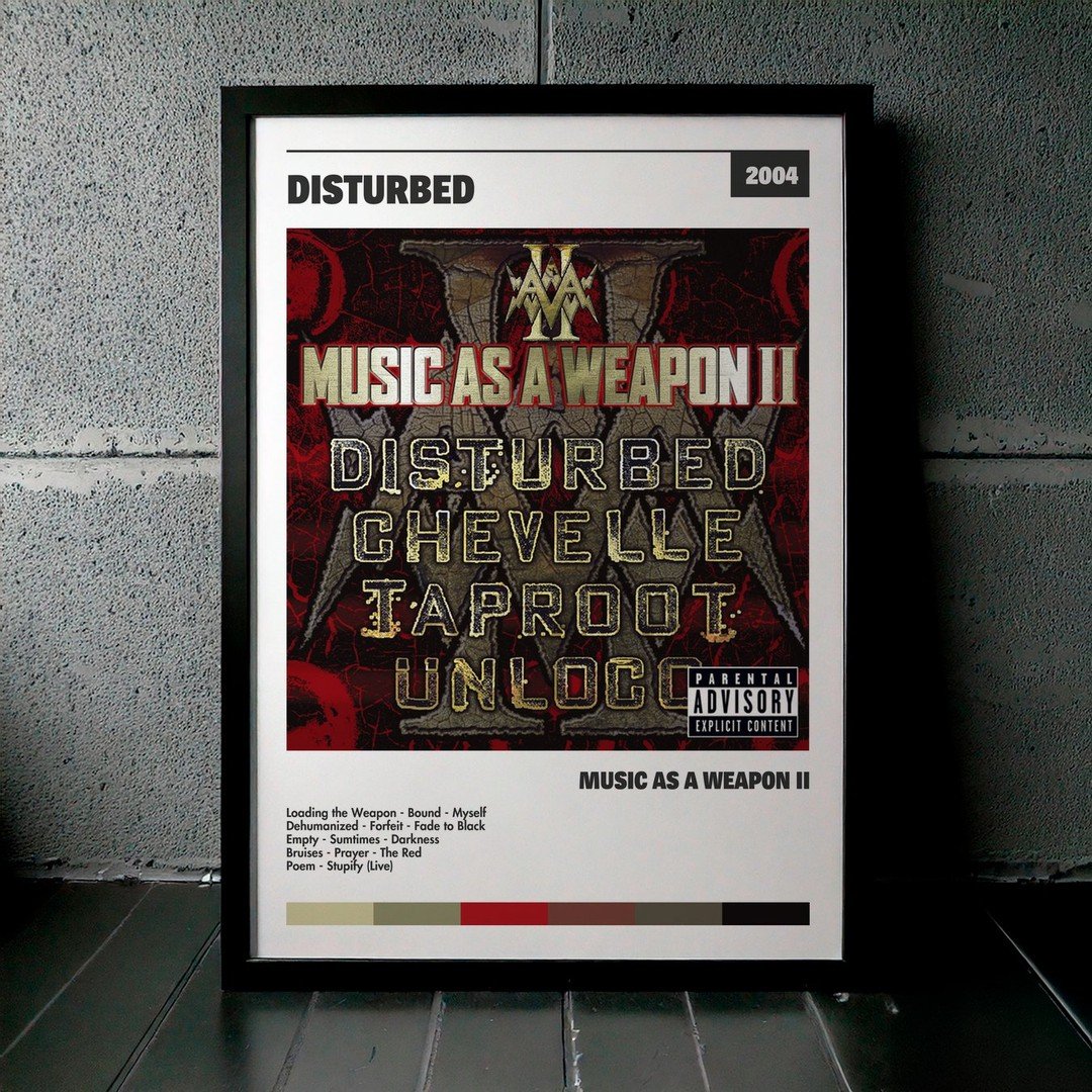 Nuestra colección de cuadros de Disturbed captura la esencia de sus álbumes más icónicos, presentados en un elegante estilo, en este caso te presentamos el de su disco Music as a Weapon II.